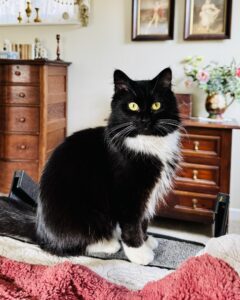 This adorable, petite, poofy, tuxedo girl has an estimated birthday of 2/1/2025. She is spayed, up to date on vaccinations and Combo test (FIV/FeLV) negative. Tuxie was rescued from being an outside cat and once at shelter had a health struggle we helped her get through. She is now a bouncing little bundle of energy that loves playing with many different types of toys (her favorite is a little red mouse and a pop up RV crinkle cube) and with other friendly cats. She has not been around dogs. Her purr and snuggliness will melt your heart. She has excellent litter box manners with feline pine pellets. Tuxie has a slight head tilt to the left, resulting from the illness she overcame. This only makes her more adorable for all that meet her.. The perfect family for Tuxie will not include small children, or people unsteady on their feet. Her perfect home will also include lots of human interaction, an assortment of toys and another cat for regular play, and a window seat to bird watch. Please complete your application on line to schedule your meet and greet at her foster home, or email kornelia@blountcountyhumanesociety.org for additional information.